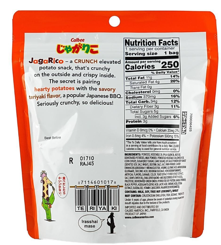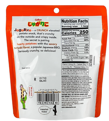 Calbee Jagarico Teriyaki brings the irresistible taste of Japan’s famous teriyaki flavor to a crunchy potato stick snack. Made with quality potatoes and seasoned with a sweet and savory teriyaki glaze, each bite delivers a perfect balance of umami and crunch. Packed in a convenient cup, Calbee Jagarico Teriyaki is ideal for on-the-go snacking, school, work, or travel. Loved for its unique texture and authentic taste, this Japanese snack is a must-try for fans of teriyaki and crispy potato treats.