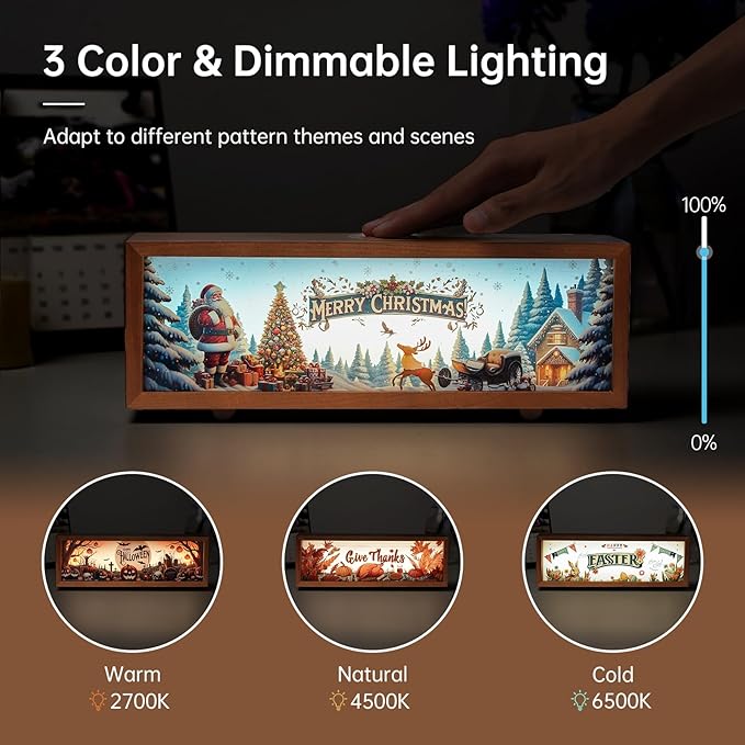 This festive night light includes 4 themed sets—Christmas, Halloween, Thanksgiving, and Easter—each featuring 3 interchangeable acrylic panels that create a vibrant 3D display. Choose from three color temperatures (2700K warm, 4000K natural, 6000K cool) and smoothly dim the brightness from 0–100%, including a relaxing breathing light mode. Crafted from eco-friendly walnut-tone wood (12" x 4.3" x 2.6"), it connects via USB (5V/1A) for energy-efficient use. Ideal for seasonal décor in bedrooms, living rooms, or offices, it also makes a thoughtful gift. More acrylic panel designs, including custom photo options, are available for added personalization.